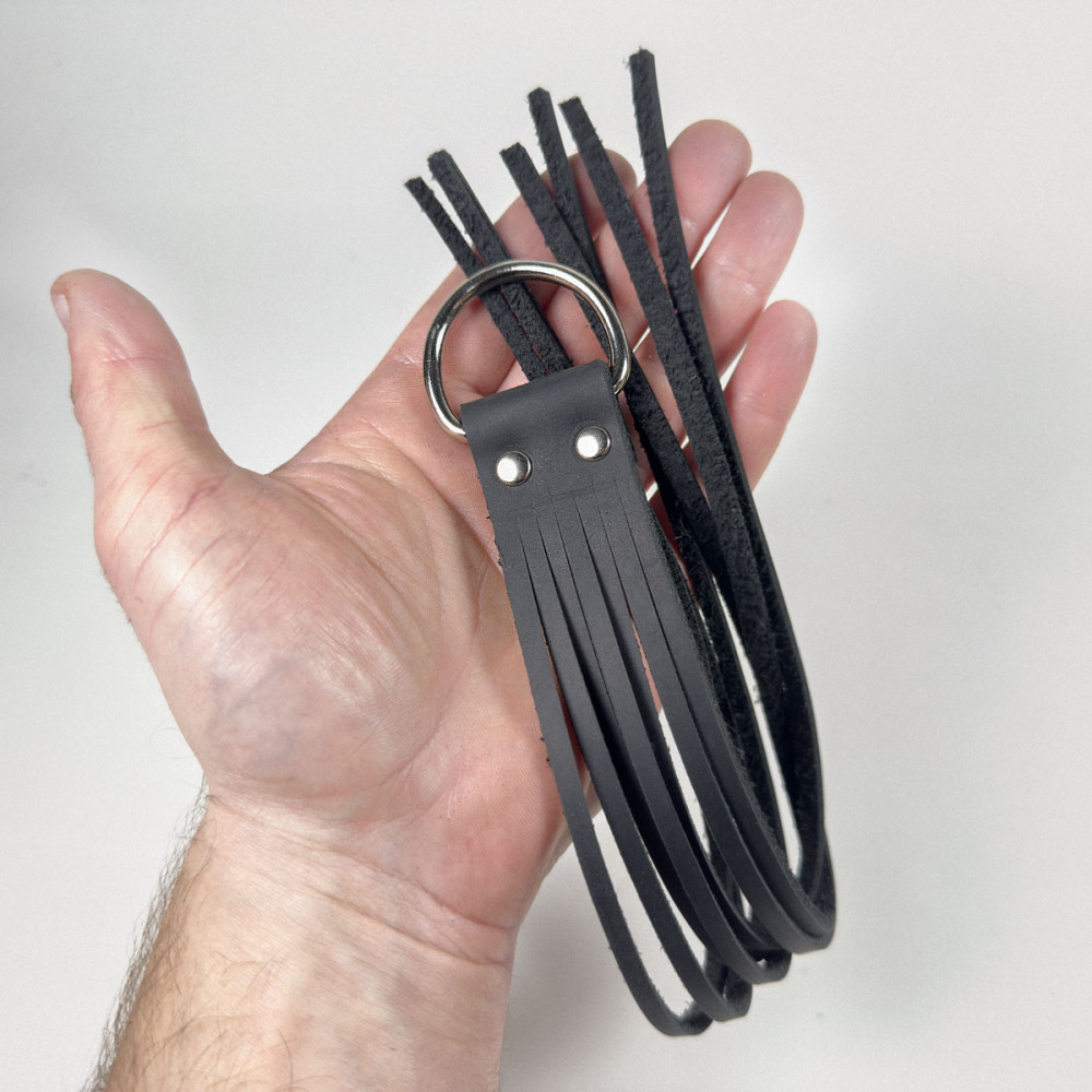 Hledáš něco malého, co ale „umí kousnout“? Tyhle mini kožené důtky jsou přesně ono. Prameny z pravé hovězí kůže se při švihu krásně sbírají a dávají ostrý, štiplavý pocit. Díky kovovému kroužku se drží pohodlně jedním prstem – kontrola a rychlost jako u velkých důtek, jen v cestovní velikosti. Vejdou se do tašky i kabelky, takže je máš kdykoli po ruce. Skvěle fungují samostatně, ale ještě lépe jako “rychlý akcent” k běžným větším důtkám s rukojetí – pro vrstvení pocitů od jemného po důraznější švih.